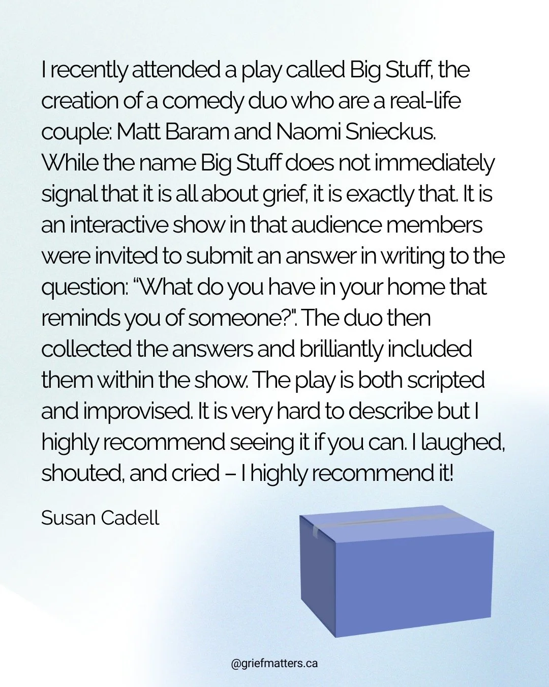 Grief Matters is a Canadian organization working to help all of us - from individuals to all of society - to better understand and make room for grief, through creative, community-based activities. All grief is welcome here. Come learn with us!